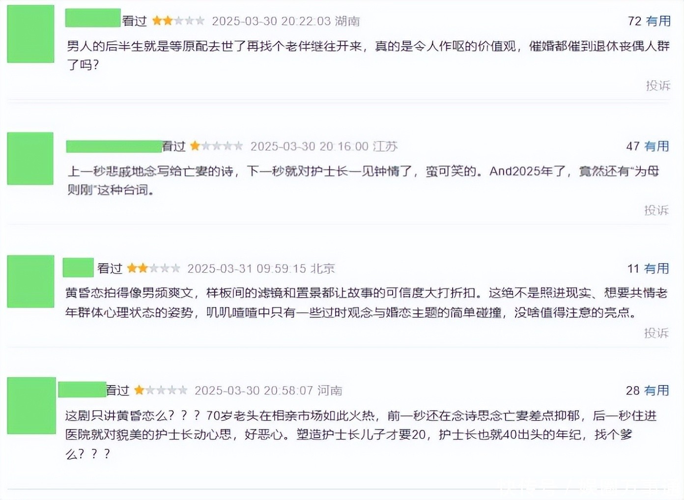 但是,看完几集之后,网上该剧的风评却出奇一致的差,大量网友在社交平台上发文称:“催婚都催到老年赛到了”、“黄昏恋拍的和男频爽文一样”“40多岁护士长对70多岁退休老头热烈追求,剧情真是疯的可以”“剧情逻辑混乱”等等批评不绝于耳。